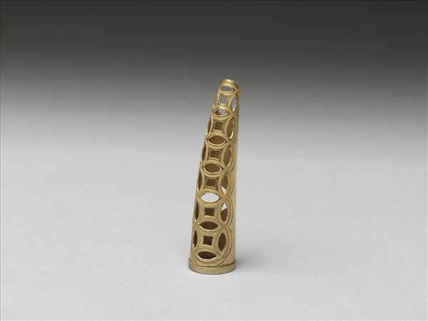 弓形,銅質鎏金,自基底至指尖漸細,面部共飾六個鏤空相扣古錢紋,錢紋上並鏨刻有魚子紋,紋飾往指尖漸小,套面銅片延伸至背部包合,使套圍大小可調整。此器與故雜3910為一對。
