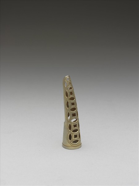 弓形,銅質鎏金,自基底至指尖漸細,面部共飾六個鏤空相扣古錢紋,錢紋上並鏨刻有魚子紋,紋飾往指尖漸小,套面銅片延伸至背部包合,使套圍大小可調整。此器與故雜3912為一對。