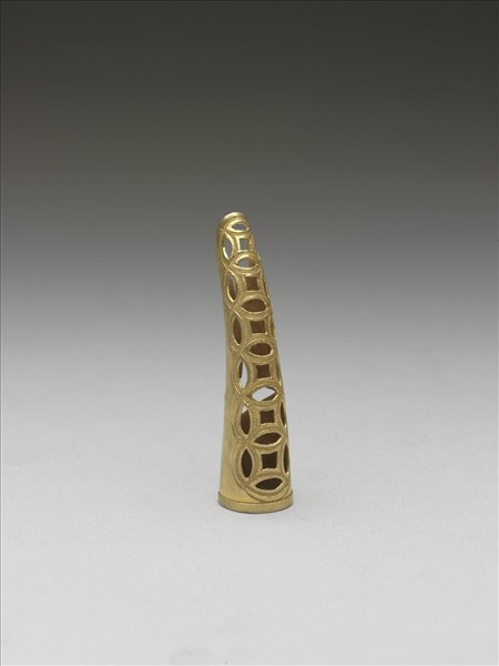 弓形,銅質鎏金,自基底至指尖漸細,面部共飾六個鏤空相扣古錢紋,錢紋上並鏨刻有魚子紋,紋飾往指尖漸小,套面銅片延伸至背部包合,使套圍大小可調整。此器與故雜3914為一對。