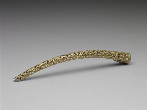 弓形,銅質鎏金,自基底至指尖漸細,套面滿飾鏤空冰片紋與梅花紋,基底有一鏤空長壽字,壽字兩旁飾蝠紋及綬帶紋各一,背部作空格式,套部為面之延伸,兩端彼此交疊使套圍可調整。此器與故雜3922為一對。