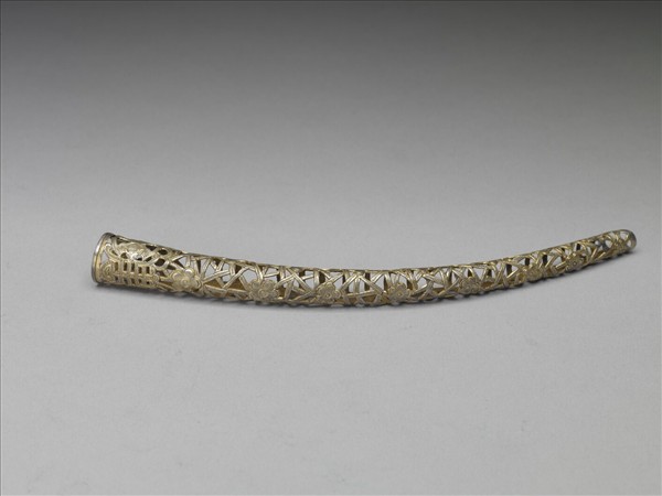 弓形,銅質鎏金,自基底至指尖漸細,套面滿飾鏤空冰片紋與梅花紋,基底有一鏤空長壽字,壽字兩旁飾蝠紋及綬帶紋各一,背部作空格式,套部為面之延伸,兩端彼此交疊使套圍可調整。此器與故雜3926為一對。