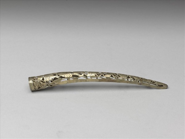 弓形,自基底至指尖漸細,套面滿飾連枝荷花與葉,葉上鏨刻有魚子紋,背部作空格式,套部為面之延伸,兩端彼此交疊使套圍可調整。此器與故雜3931為一對。