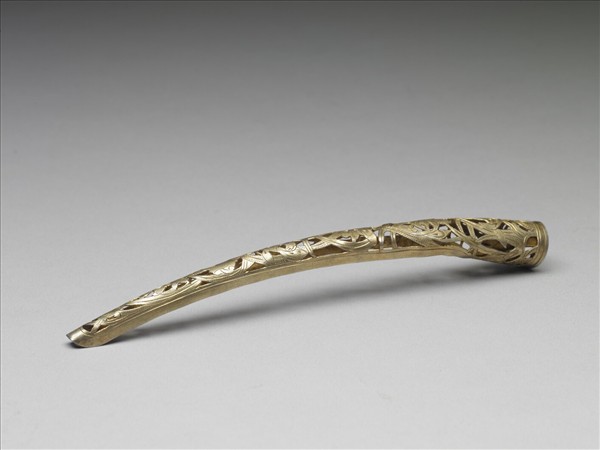 弓形,自基底至指尖漸細,套面滿飾鏤空蘭花與葉,葉上鏨刻有魚子紋,背部作空格式,套部為面之延伸,兩端彼此交疊使套圍可調整。此器與故雜3934為一對。