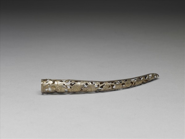 弓形,銅質鎏金,自基底至指尖漸細,整器滿飾鏤空海棠與葉,葉上以陰線刻畫葉脈,套部為面之延伸,兩端彼此交疊使套圍可調整。此器與故雜3936為一對。