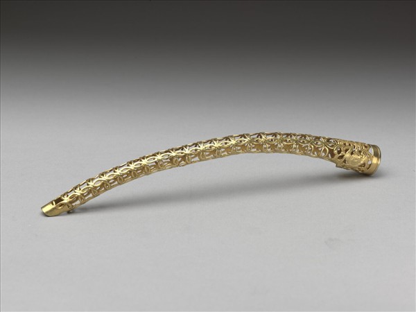 弓形,從基部到指尖漸漸變細,基座有一壽字紋,左右各有蝙蝠,呈兩蝠捧壽。壽字紋面上飾連珠紋,面作鏤空古錢紋,紋飾從指尖逐漸變小,背部作空格式。此器與故雜3949為一對。