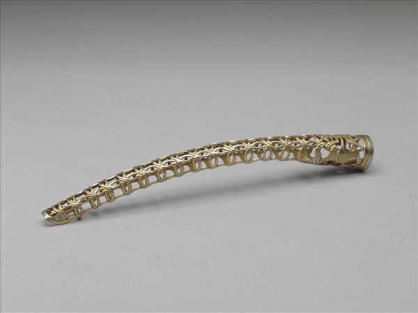弓形,從基部到指尖漸漸變細,基座有一壽字紋,左右各有蝙蝠,呈兩蝠捧壽。壽字紋面上飾連珠紋,面作鏤空古錢紋,紋飾從指尖逐漸變小,背部作空格式。此器與故雜3955為一對。