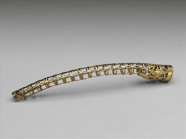 弓形,從基部到指尖漸漸變細,基座有一壽字紋,左右各有蝙蝠,呈兩蝠捧壽。壽字紋面上飾連珠紋,面作鏤空古錢紋,紋飾從指尖逐漸變小,背部作空格式。此器與故雜3961為一對。