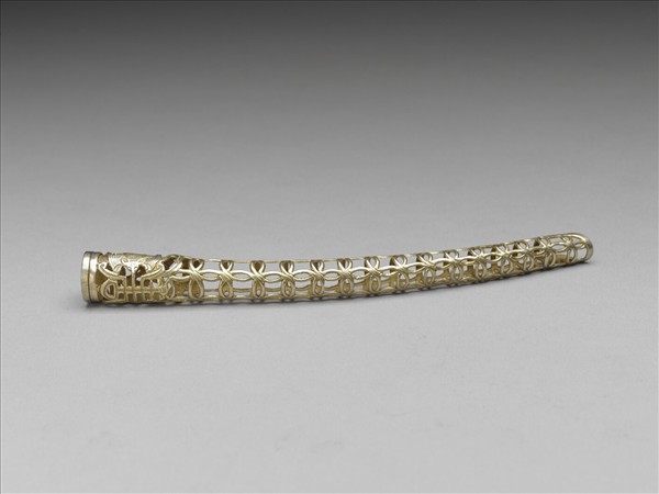 弓形,從基部到指尖漸漸變細,基座有一壽字紋,左右各有蝙蝠,呈兩蝠捧壽。壽字紋面上飾連珠紋,面作鏤空古錢紋,紋飾從指尖逐漸變小,背部作空格式。此器與故雜3960為一對。