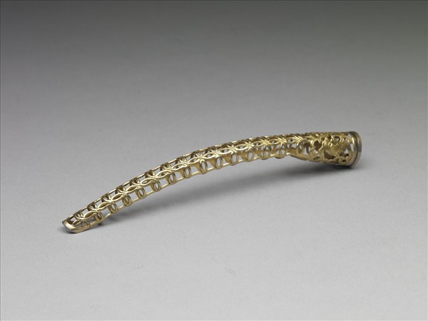 弓形,從基部到指尖漸漸變細,基座有一壽字紋,左右各有蝙蝠,呈兩蝠捧壽。壽字紋面上飾連珠紋,面作鏤空古錢紋,紋飾從指尖逐漸變小,背部作空格式。此器與故雜3965為一對。