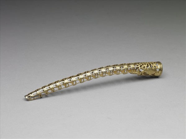 弓形,從基部到指尖漸漸變細,基座有一壽字紋,左右各有蝙蝠,呈兩蝠捧壽。壽字紋面上飾連珠紋,面作鏤空古錢紋,紋飾從指尖逐漸變小,背部作空格式。此器與故雜3964為一對。
