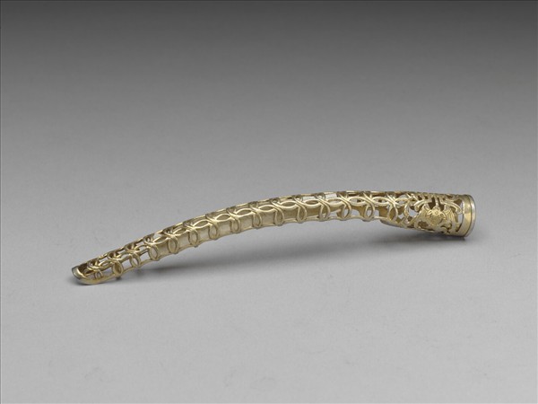 弓形,從基部到指尖漸漸變細,基座有一壽字紋,左右各有蝙蝠,呈兩蝠捧壽。壽字紋面上飾連珠紋,面作鏤空雙古錢紋,紋飾從指尖逐漸變小,背部作空格式。此器與故雜3968為一對。