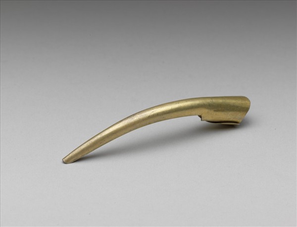 弓形,從基部到指尖漸漸變細,素面,背部作空格式。此器與故雜3978為一對。