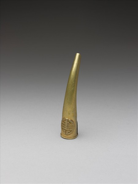 弓形,從基部到指尖漸漸變細,基部有團壽字裝飾,面光素,基背部包合。此器與故雜3988為一對。