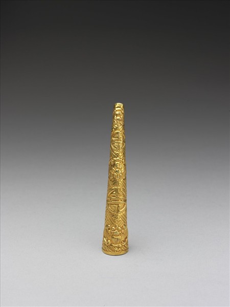 弓形,從基部到指尖漸漸變細,面作壽字紋和蝠交替,以卍字紋為地,紋飾從指尖逐漸變小,背部作空格式。此器與故雜4001為一對。