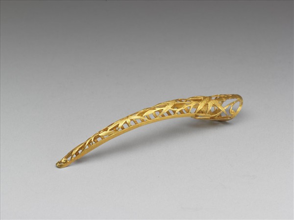 弓形,從基部到指尖漸漸變細,整體雕鏤空竹葉紋,竹葉以連珠紋為地,紋飾從指尖逐漸變小,背部作空格式。此器與故雜4004為一對。