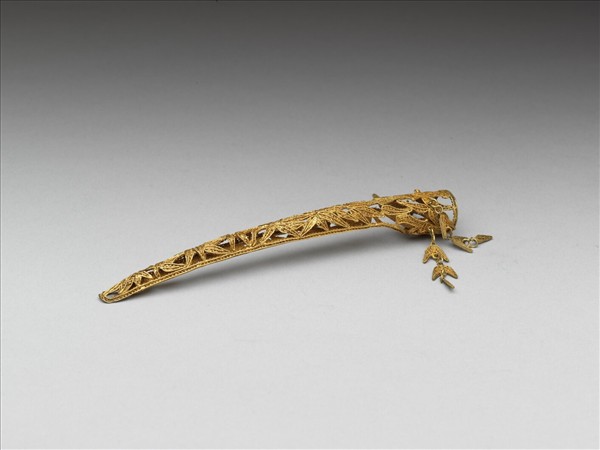 弓形,從基部到指尖漸漸變細,整體為纍絲竹葉紋,紋飾從指尖逐漸變小,基部垂飾竹葉流蘇,背部作空格式,背面另飾有纍絲竹葉紋。此器與故雜4014為一對。