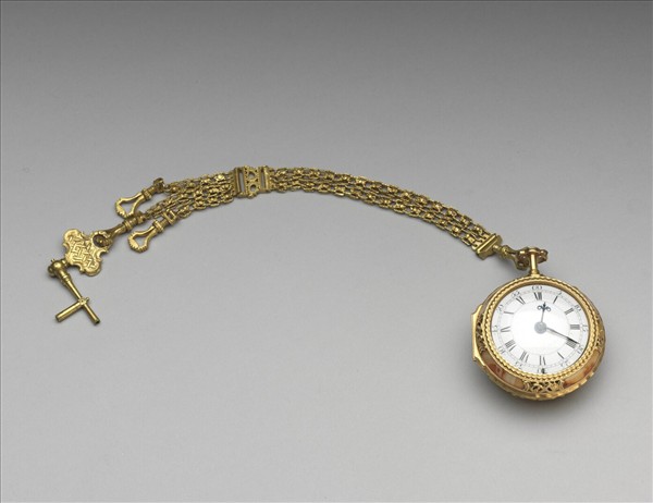圓形錶,表面有時、分、秒針及羅馬數字,表背飾紅色花卉圖樣,蓋可開闔,蓋面為透明可露出錶面,背面雕連枝花卉,周邊飾以鏤空捲草紋。附長鏈兩串,下綴鑰匙。