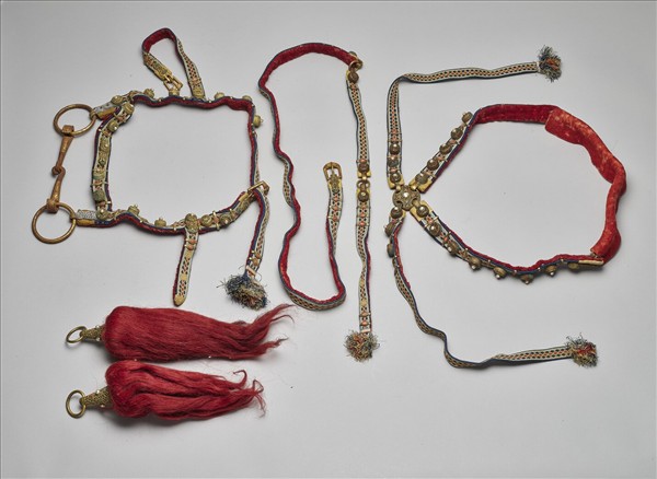 纓長約33.0公分 徑約7.0公分;絡頭寬約31.0公分;胸帶長166.0公分 寬2.2公分;鞧帶長約110.0公分 寬2.2公分