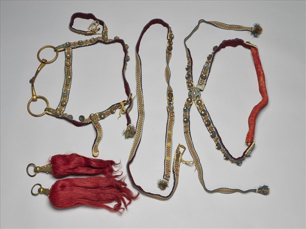 纓全長約37.0公分 徑約5.0公分;絡頭寬約31.0公分;胸帶長184.0公分 寬2.2公分;鞧帶長約120.0公分 寬2.2~5.3公分