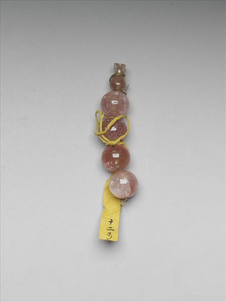 四顆碧璽佛頭末端墜一顆葫蘆形的佛塔。在念珠之中,通常每隔二十七顆穿入一顆不同材質的大珠,稱佛頭,而佛塔通常由黃縧串成垂於背後。