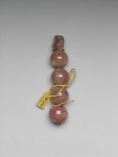 四顆碧璽佛頭末端墜一顆葫蘆形的佛塔。在念珠之中,通常每隔二十七顆穿入一顆不同材質的大珠,稱佛頭,而佛塔通常由黃縧串成垂於背後。