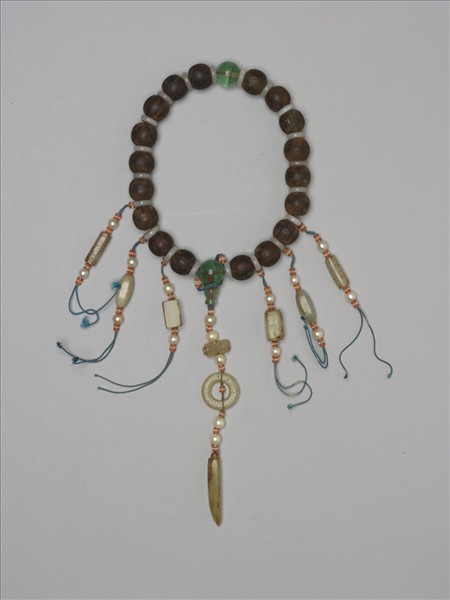 茄楠木再加白玉扁珠串成,以綠色玻璃為佛頭、佛頭塔,下方則以古玉勝形佩、玉環、玉笄等串成,兩旁各飾三串古玉串飾。珠徑大,十分難得。