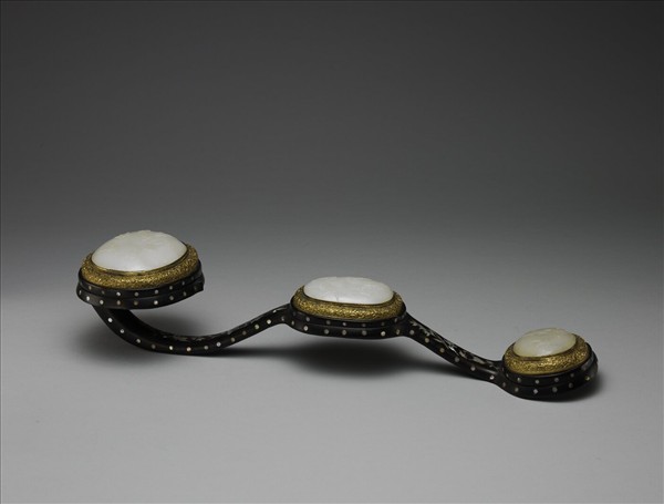 三鑲如意,紫檀如意座,首玉淺浮雕飄帶繫三桂圓及喜鵲紋,意寓喜報三元(狀元、會元、解元),腹玉淺浮雕喜鵲、芝枝,趾玉淺浮雕喜鵲及花葉紋,三個紫檀鑲座內均有鐫桃花蝴蝶紋的鍍金鑲框;柄中央隆起,柄面嵌花蝶螺鈿。