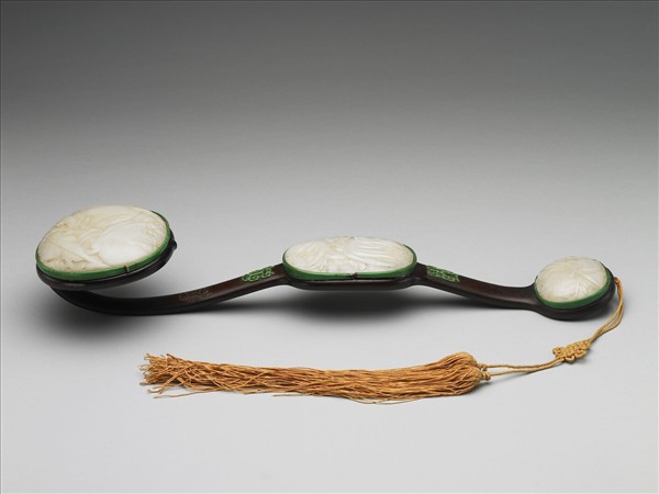 三鑲如意,紅木如意座,首腹趾的橢圓形茜牙鑲框中,分別鑲浮雕桃實、佛手、石榴之白玉各一,寓意多福、多壽、多子。柄中隆起,柄面鑲茜牙拐子龍圖案。背光素。趾端繫黃雙穗、飾節。
