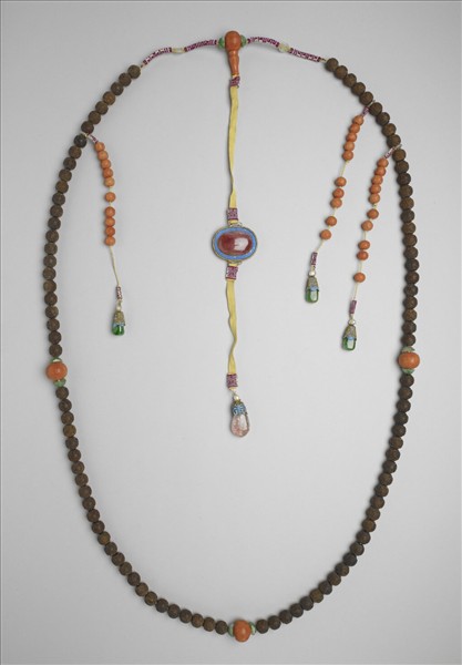 茄楠木朝珠,計有一百八十粒,每隔二十七粒加入一珊瑚珠。三條記捻都穿有珊瑚珠,下有墜角。佛頭塔以黃絲長帶連背雲與墜角。以「朝珠」作為帝王大臣、命婦穿著朝服或吉服時垂掛於胸前的飾物,是清代特別的傳統,清高宗欽定《皇朝禮器圖式》中,便明確列出在各種祭典與不同身份的人,必須要使用特定形式的朝珠,足見清代官方將此項裝飾傳統視為定制。