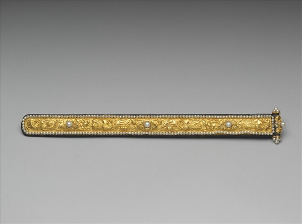 扁長形髮簪是滿族貴族婦女梳兩把式旗頭,用以盤繞固定髮髻之物。製作材質多元,包括金銀、珠玉、香木、玳瑁等,大多造型簡約,融入各式吉祥裝飾紋樣。此作以玳瑁為座,內嵌金片,鐫花鳥紋,花蕊嵌珠,四周嵌小珍珠,軸嵌金蝙蝠。
