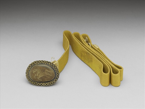 纍絲金錢紋帶頭座,中嵌黃褐色奔馬紋石。明黃腰帶。