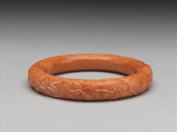 紅珊瑚鐲一對(故雜4179~4180),圓弧狀外緣淺浮雕回紋錦地及轉枝葫蘆。枝葉藤蔓盤繞迴旋,生意畢具,襯以連續回紋,寓意瓜瓞綿綿,子孫萬代。