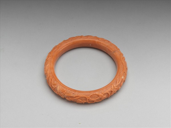 紅珊瑚鐲,圓弧狀外緣淺浮雕回紋錦地及轉枝葫蘆。枝葉藤蔓盤繞迴旋,生意畢具,襯以連續回紋,寓意瓜瓞綿綿,子孫萬代。