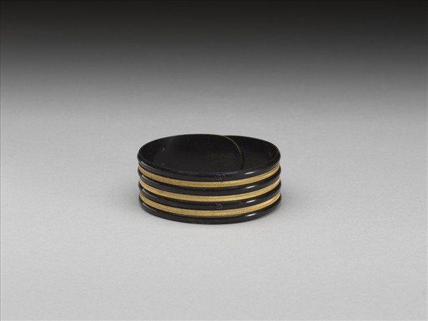 黑牛角鐲,面嵌金,飾弦紋。鐲之大小可伸縮。