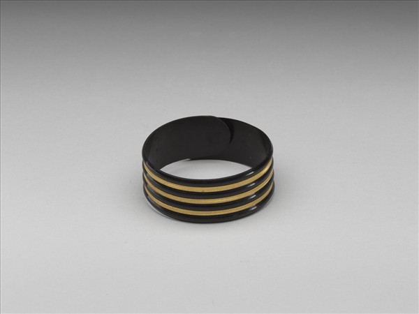 黑牛角鐲,面嵌金,飾弦紋。鐲之大小可伸縮。