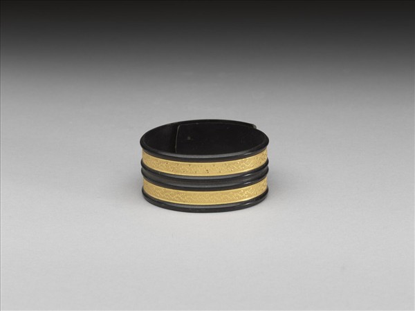 黑牛角鐲,面嵌金。鐲之大小可伸縮。