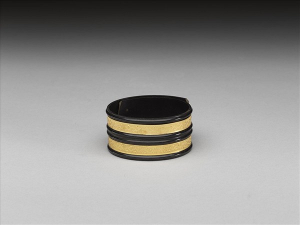 黑牛角鐲,面嵌金。鐲之大小可伸縮。