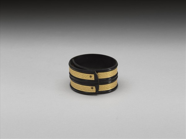 黑牛角鐲,面嵌金。鐲之大小可伸縮。