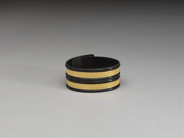 黑牛角鐲,面嵌金。鐲之大小可伸縮。