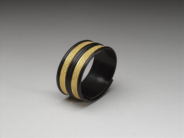 黑牛角鐲,面嵌金。鐲之大小可伸縮。