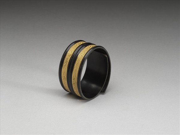 黑牛角鐲,面嵌金。鐲之大小可伸縮。