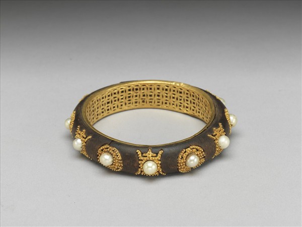 鏤空古錢紋鐲座,外包沉香木,並於其上嵌金質長壽及團壽,每一壽字上嵌飾珍珠。
