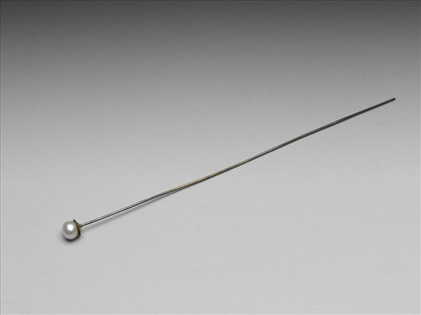 銀鍍金簪,桿細長,簪首鑲嵌單顆珍珠,造形簡單素雅。