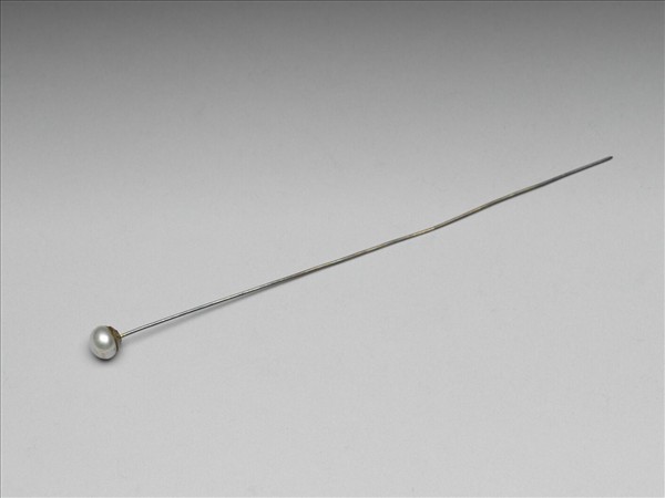 銀鍍金簪,桿細長,簪首鑲嵌單顆珍珠,造形簡單素雅。