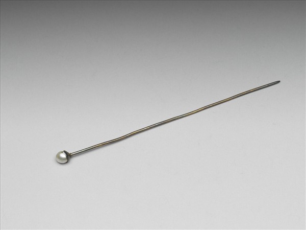 銀鍍金簪,桿細長,簪首鑲嵌單顆珍珠,造形簡單素雅。