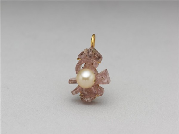 粉色碧璽耳環(故雜4393~ 4394為一對),鏤雕作壽字,嵌於銀鍍金耳環座,碧璽正中飾單顆珍珠,並以金屬絲固定。
