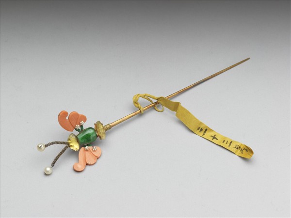 銀鍍金針簪,簪首飾蝴蝶,孔雀石雕作蝶身固定於針鋌上,頭、尾為黃料,珊瑚雙翅刻陰線紋為翅脈,飾花狀米珠,並以有色金屬線圈綑綁於蝶身兩側。頭針首觸鬚一對,作兩長條形纍絲,鬚端各飾珍珠一粒。嵌蝶身的底座以金屬線纏繞固定於頭針鋌上,造形素雅簡潔。