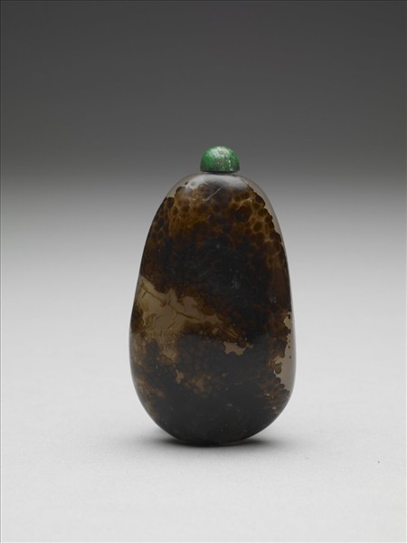 瓜形瑪瑙鼻煙壺,半透明灰色,帶葡萄狀斑紋。壺身一面素淨,另面保留瑪瑙特殊紋路,具兩種不同趣味,為工匠雕琢之巧意。帶孔雀石蓋及玳瑁匙。