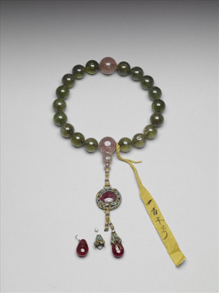 碧璽手串,綠色碧璽十八粒,中間串粉色碧璽佛頭二粒、佛塔一件,下綴黃縧,間串點翠嵌紅色寶石背雲一件、墜角二件。