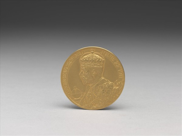 英皇喬治五世加冕紀念幣,銅鍍金質,一面鑄喬治五世側面像,另面為瑪麗皇后。皆頭戴加冕冠,著加冕儀式禮服,喬治五世身旁有一權杖。兩面幣緣分別鑄「GEORGE Ⅴ CROWNED JUNE 22 1911」、「QUEEN MARY JUNE 22 1911」,為喬治五世舉行加冕儀式的日子。
